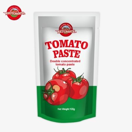 टमाटर के पेस्ट का 100 ग्राम का एक स्टैंड-अप थैली विभिन्न व्यंजनों के लिए सुविधा और बहुमुखी प्रतिभा प्रदान करता हैः